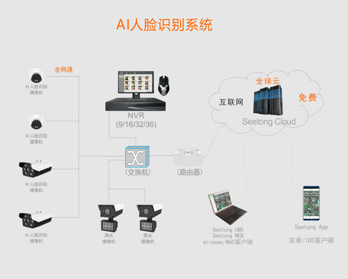 AI人臉識別系統是一套由TH42P與全系列NVR組合成的高穩定性AI系統;NVR上可以以人臉圖片搜索圖片、以人...